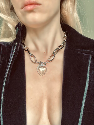 Made of two Antique Silver metal snake-heads that slide on and off the ring that they are attached to. The pendant that is attached to the ring is an untreated, natural, REAL, A quality, White/Rainbow colored Baroque Pearl. (It really is GORGEOUS and has a full weight to it). The chain is a high grade, twisted Metallic Silver Rayon Satin Rope Silk Braid Cord.
